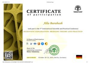 2. Шпомер А.І. Міжнародна програма стажування в рамках Міжнародної весняної школи «Інклюзія, соціальна відповідальність та підприємництво. Соціальні інновації для розвитку громад та залучення молоді» 17 березня – 18 квітня 2025 року (сертифікат № 2025SPS-000550 ( загальна кількість годин 180, 6 ECTS )