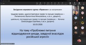 6 березня 2026 року відбулося чергове засідання наукового гуртка «Правник» за напрямами трудове право, адміністративне право та процес (керівник – Валентина Литвиненко, к.ю.н., доцент) та цивільне, го